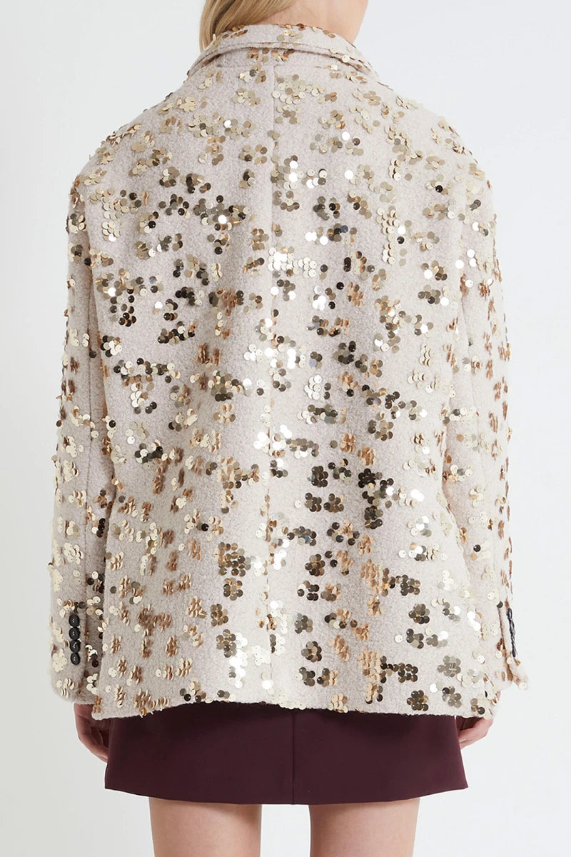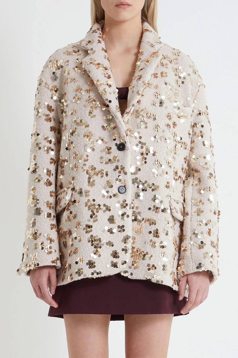 Giacca in misto lana con paillettes cucite all over, chiusura frontale con bottoni, collo revers, due tasche sul davanti con patta e un taschino sul petto, interno foderato, spacchi laterali, bottoni sul fondo manica