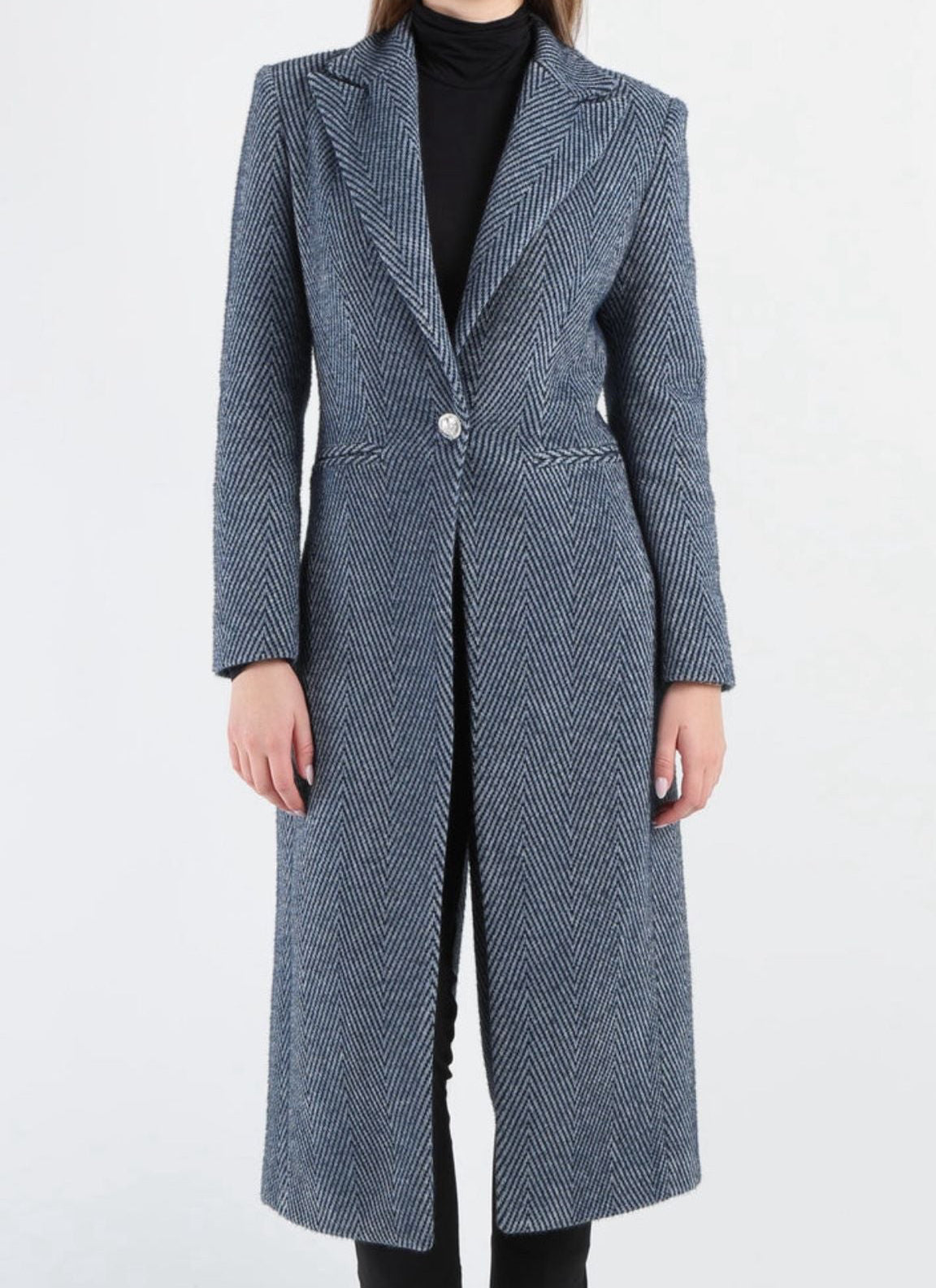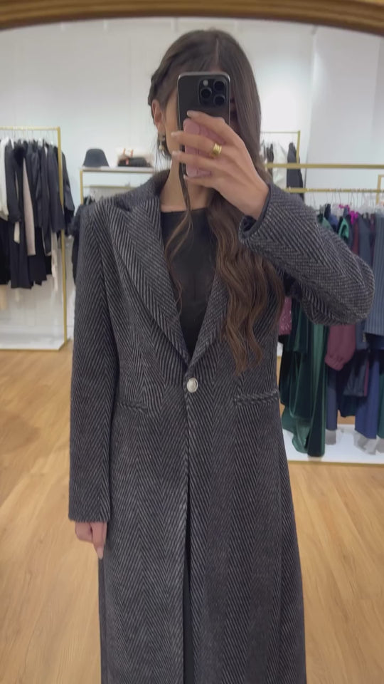 Cappotto spigato grigio/nero con microlurex e bottone oro. Modello avvitato.