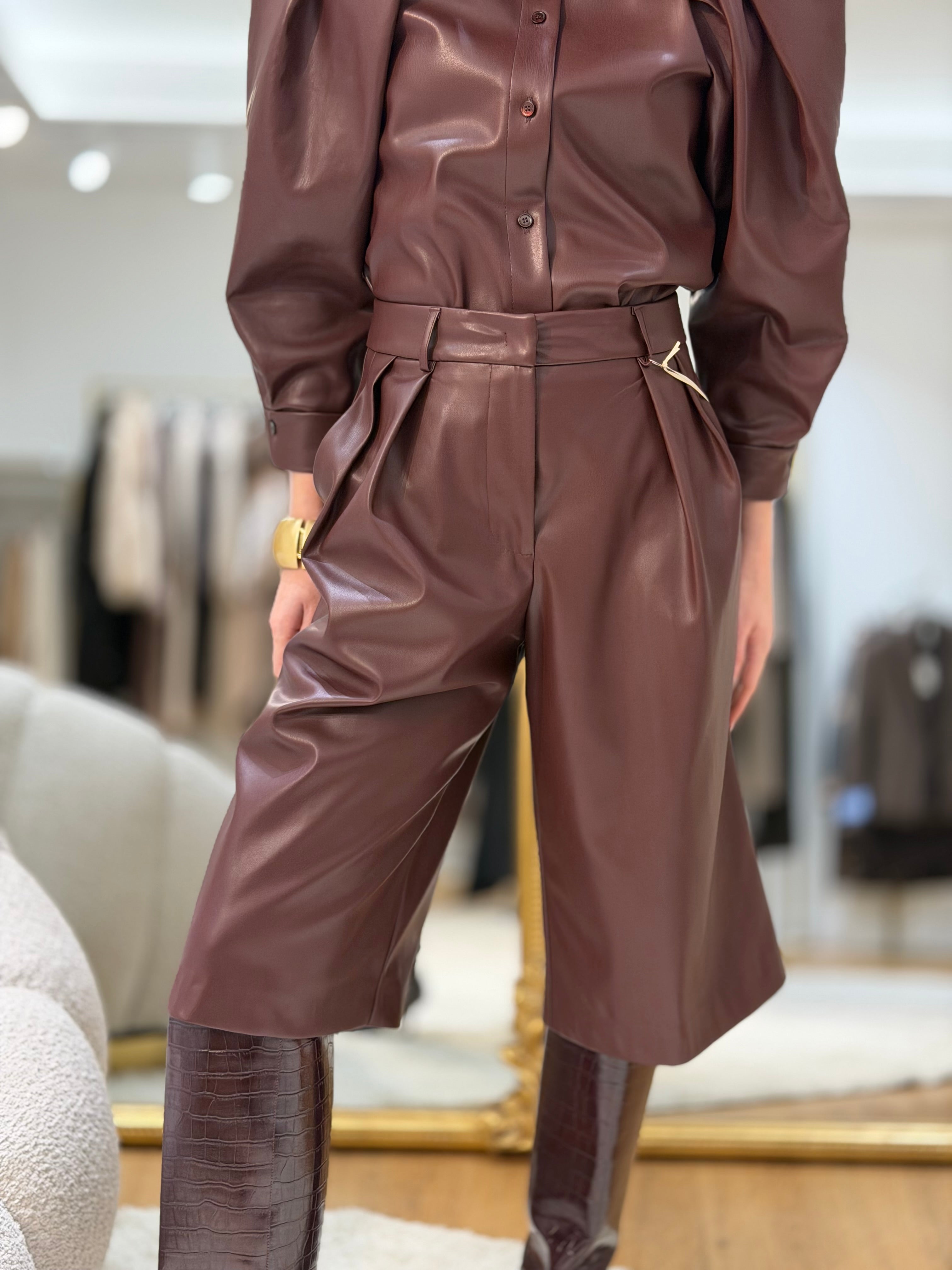 Bermuda in ecopelle con pences. Perfetto da abbinare alla camicia coordinata per un completo moderno e sofisticato.