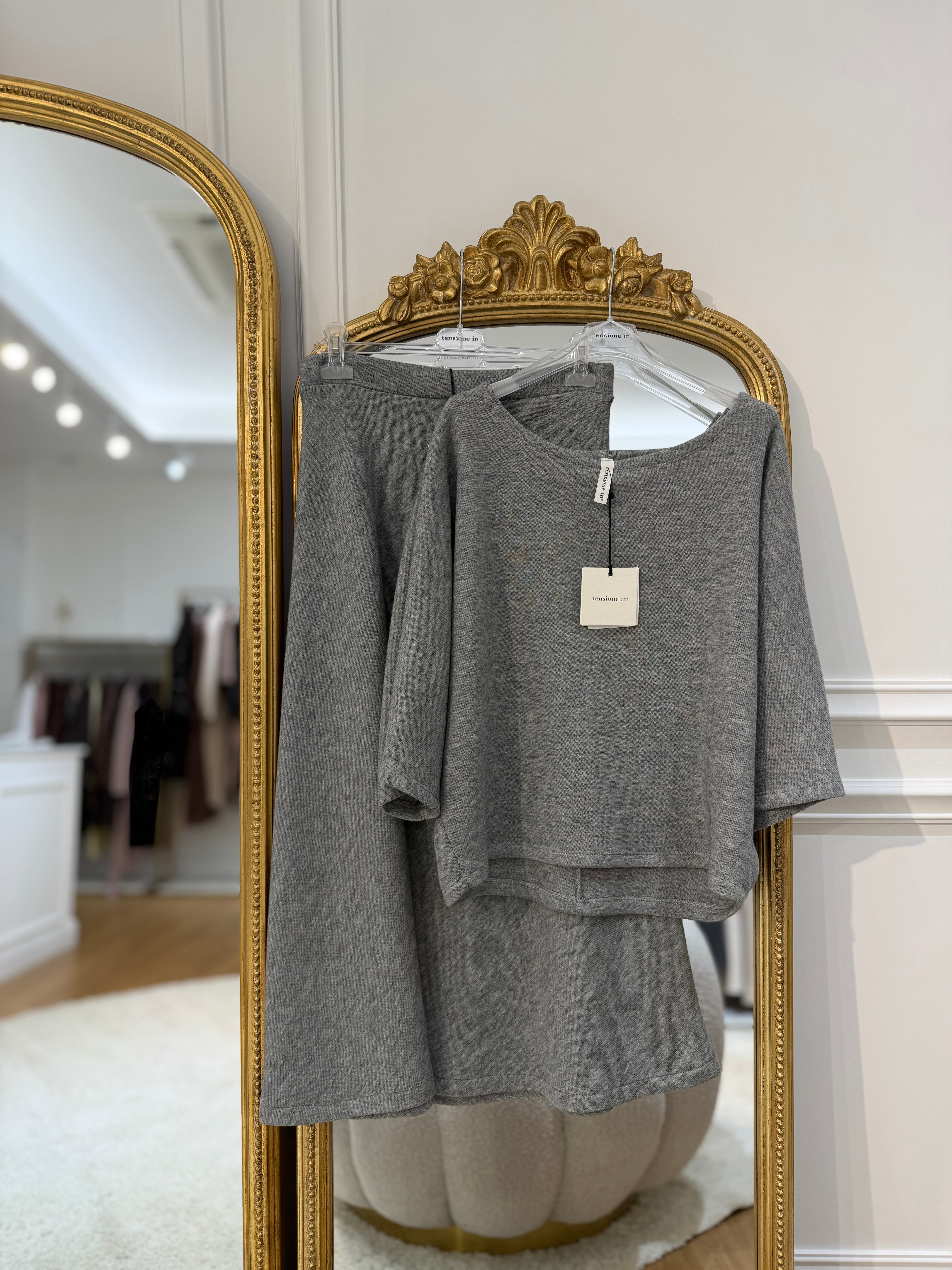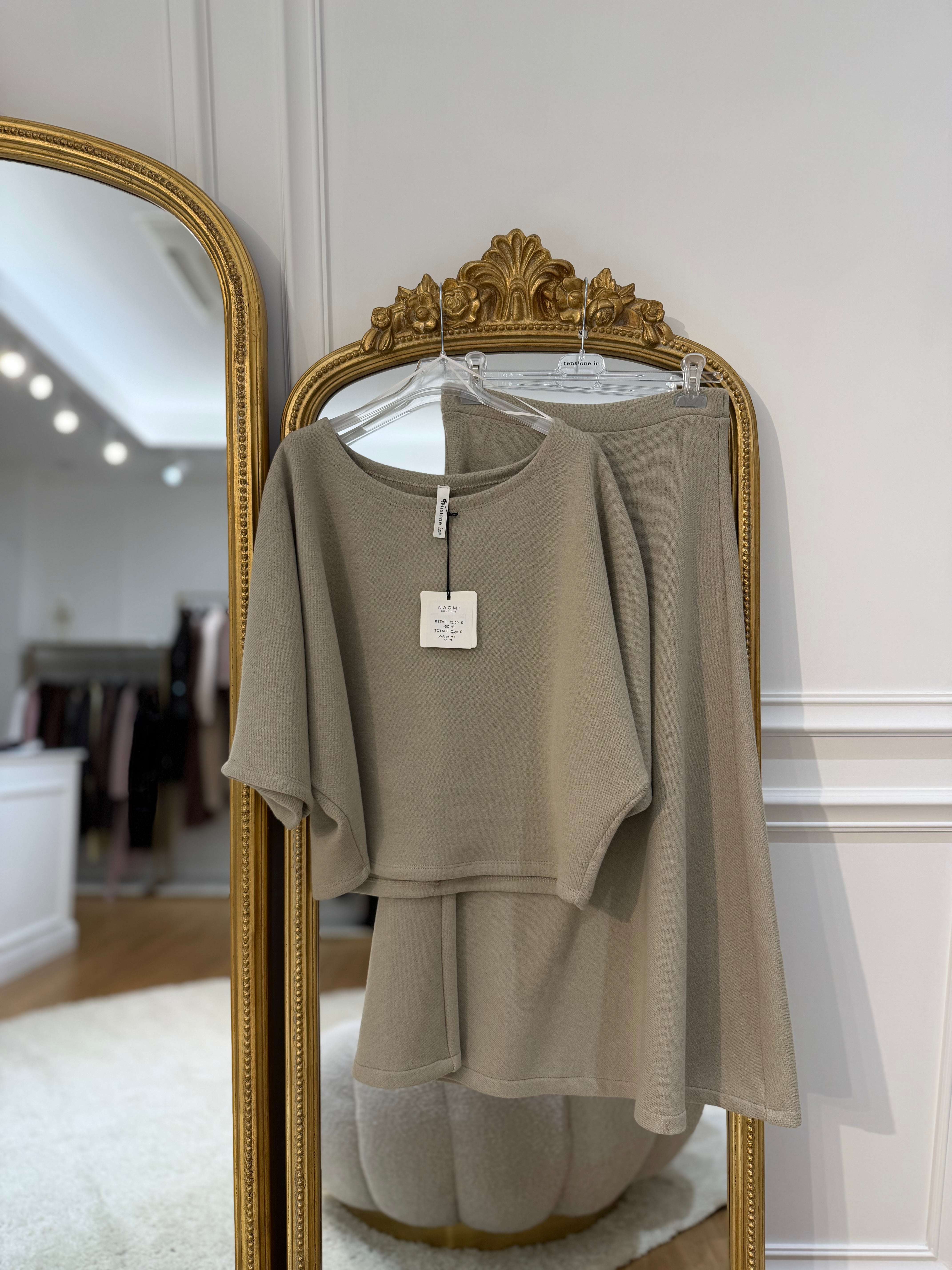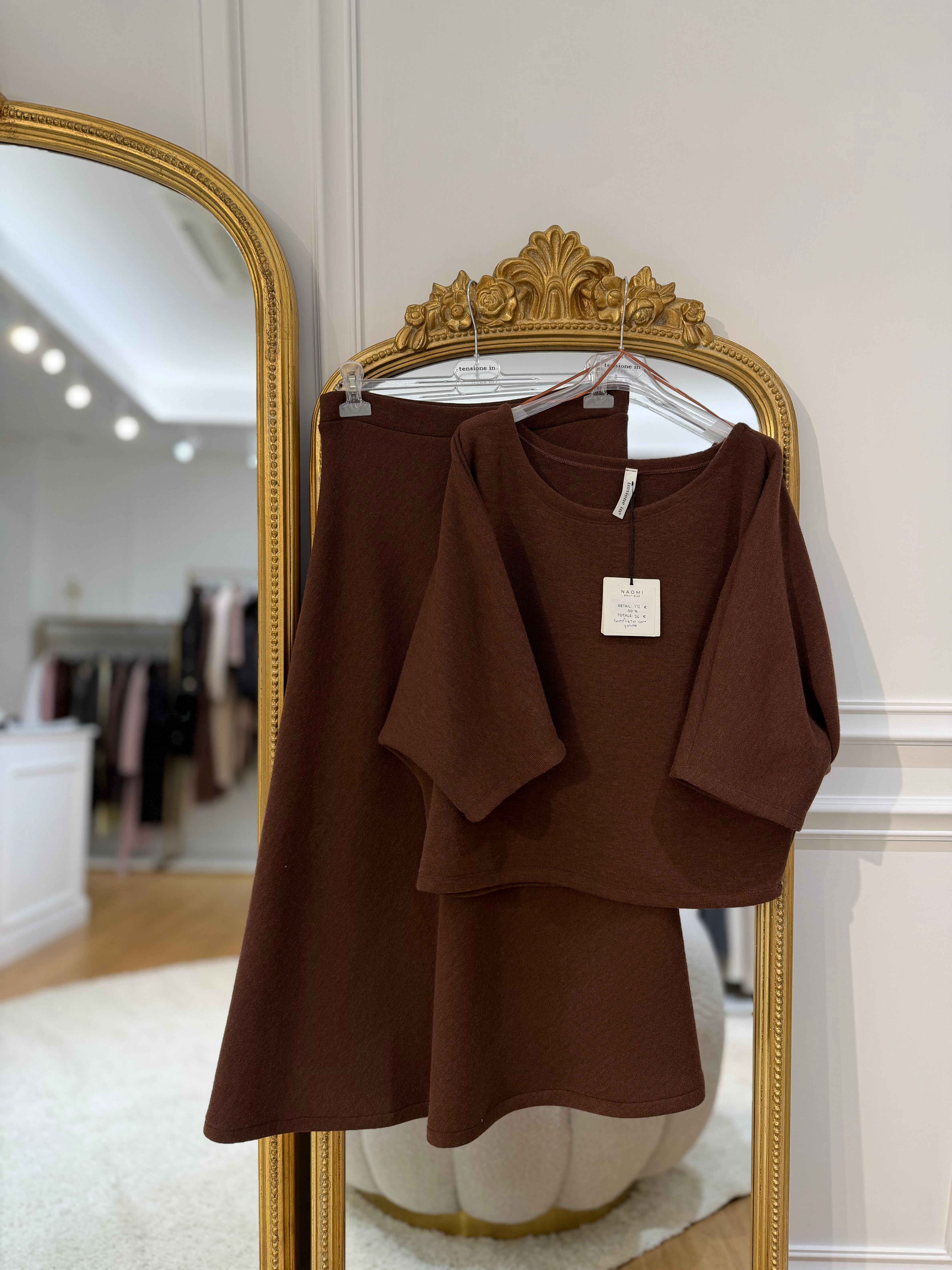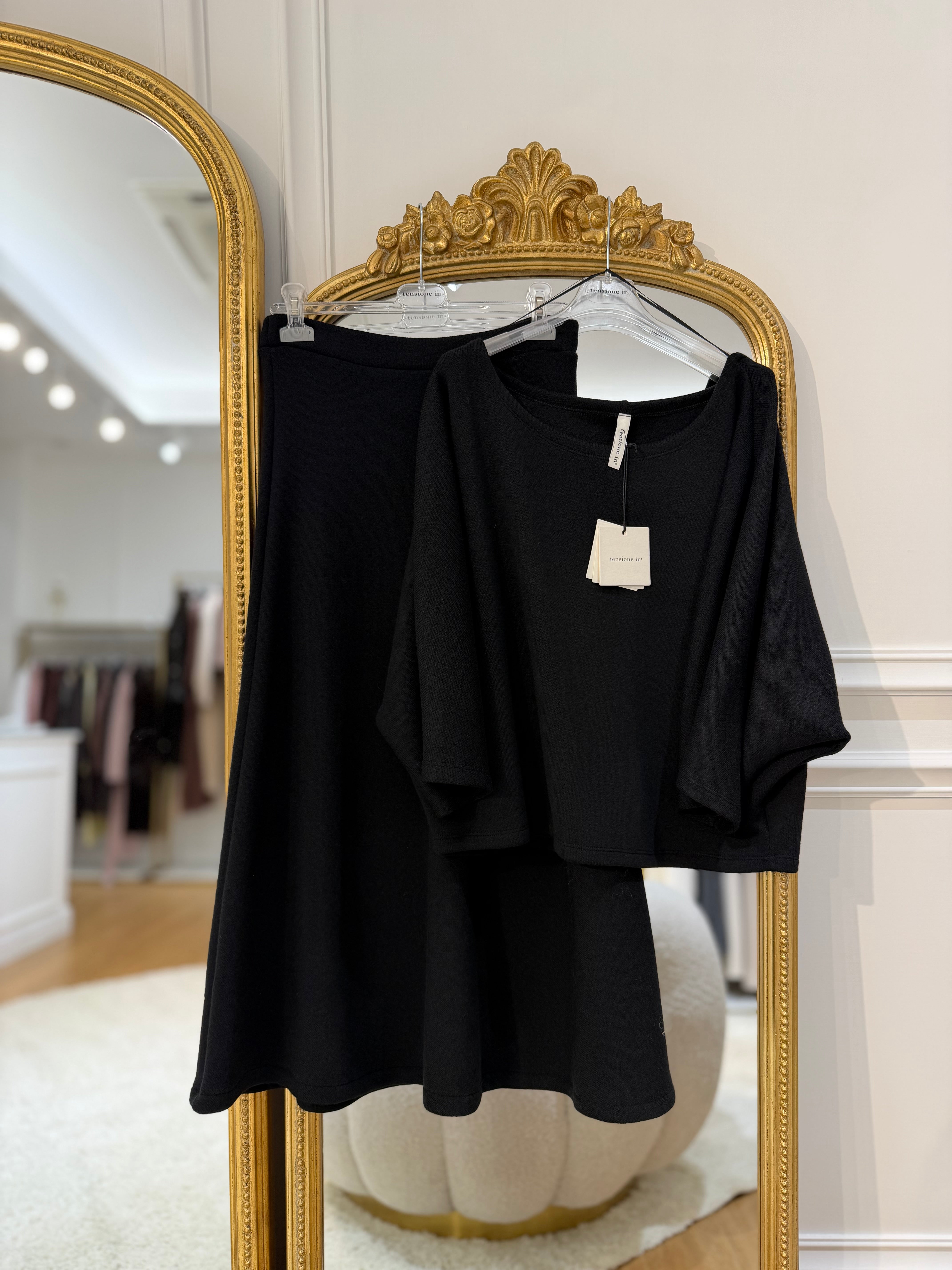 Coordinato in maglia tensione in composto da maglia e gonna svasata midi coordinata.