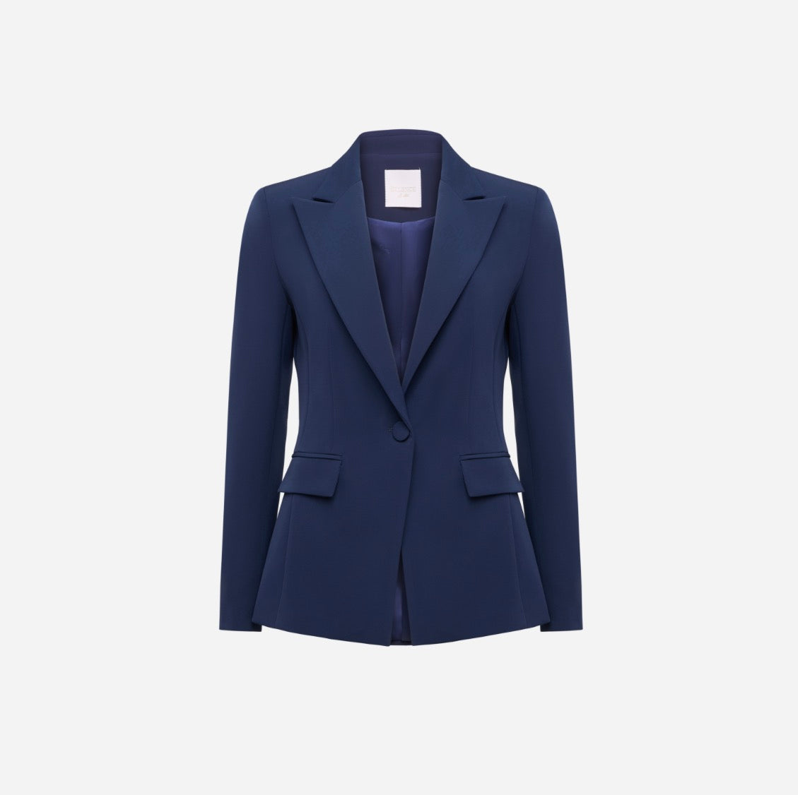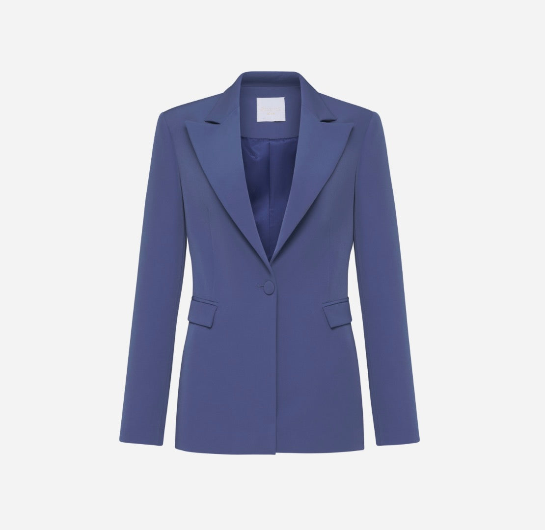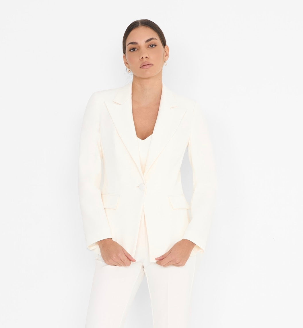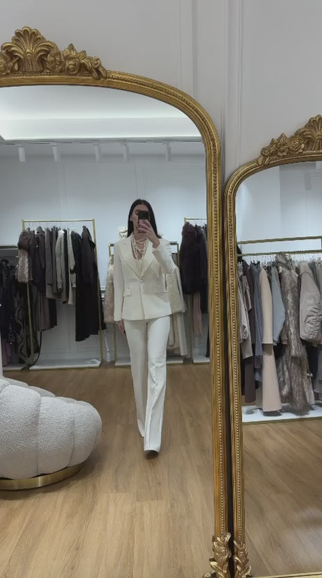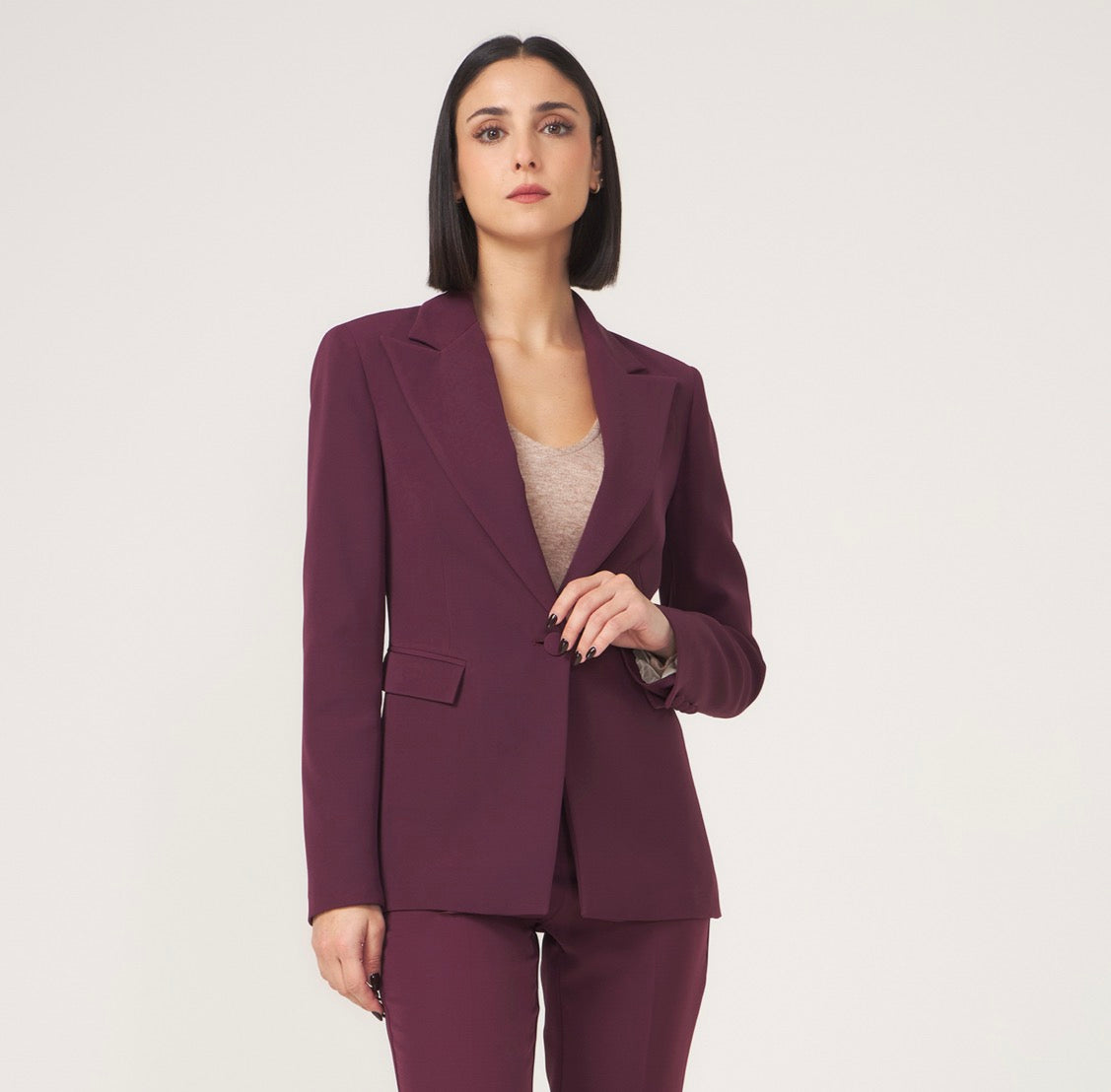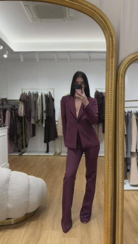 Il tailleur include giacca e pantalone. Blazer monopetto dal taglio elegante e tessuto tecnico, abbinato a pantalone flare coordinato. Giacca e pantalone sono realizzati nello stesso colore e tessuto; eventuali differenze visive sono dovute alle immagini.