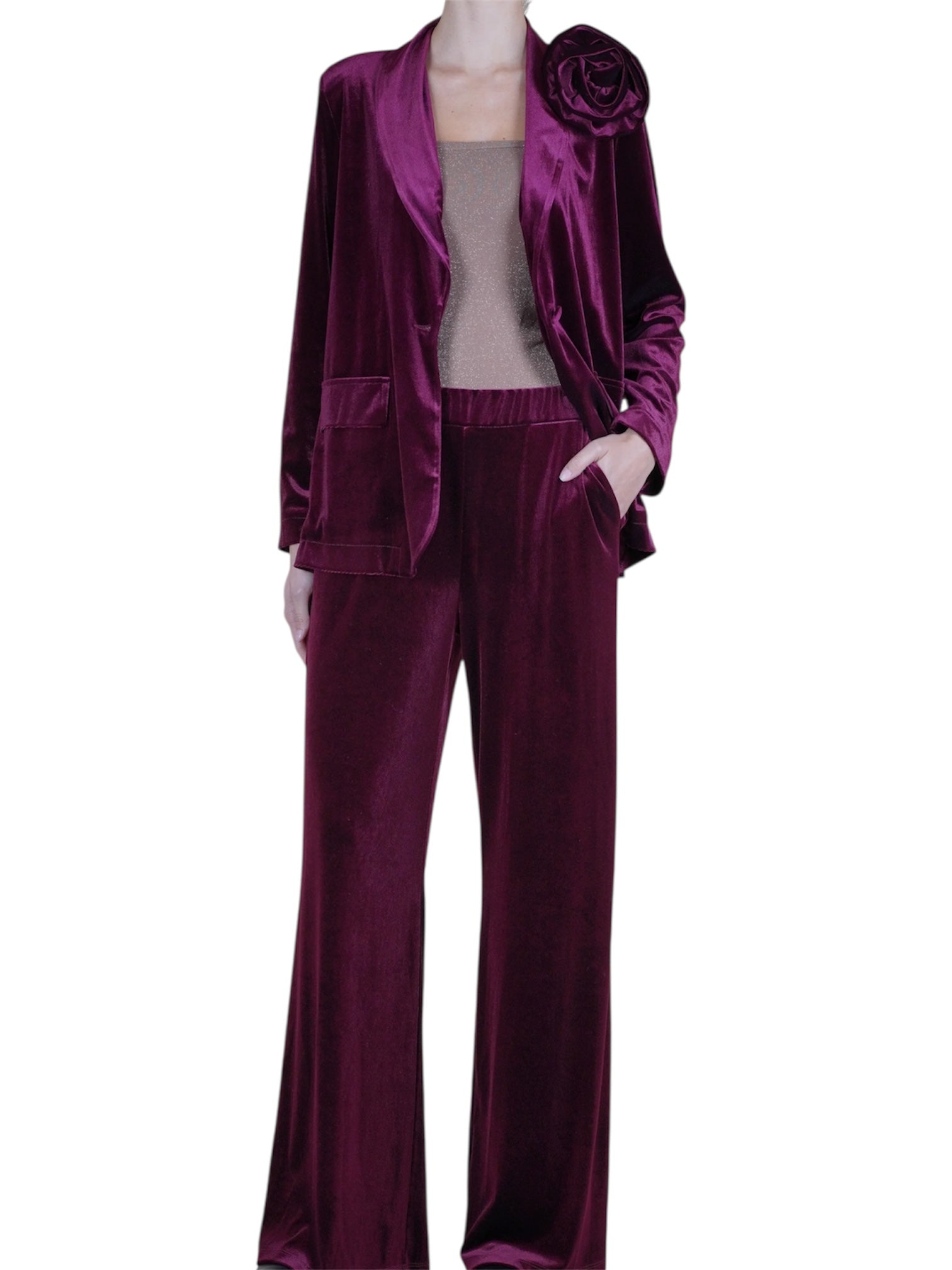 Tailleur Tensione in con giacca monopetto e pantaloni palazzo a vita elastica. Tessuto morbido. Dettaglio spilla a forma di fiore rimovibile. Ideale per occasioni speciali o per un look sofisticato e comodo.