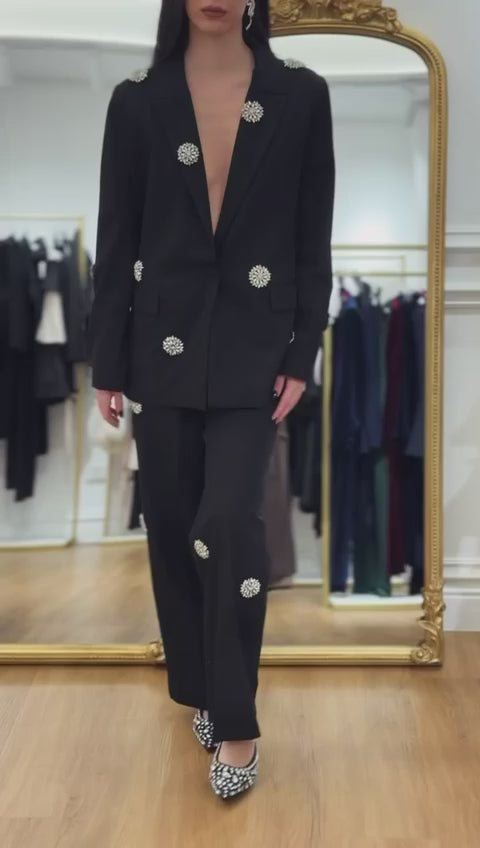 Questo tailleur in tessuto è arricchito da pietre di cristallo per un tocco di eleganza e raffinatezza. Con la sua giacca monopetto e il pantalone palazzo, questo ensemble ti farà distinguere nella folla. Mai più passare inosservati con il nostro Tailleur Cristalli by Tensione in.