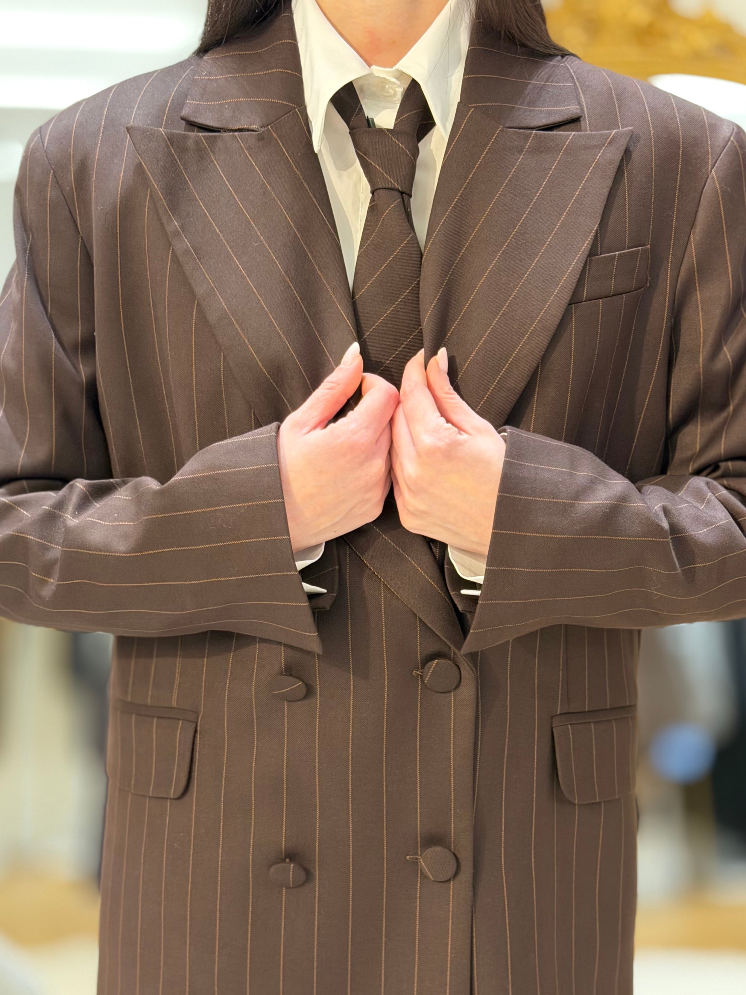 Tailleur gessato dal taglio maschile con cravatta inclusa. Giacca over con spalline strutturate e pantalone palazzo a vita alta. Un completo deciso e sofisticato, che unisce ispirazione sartoriale e femminilità contemporanea.